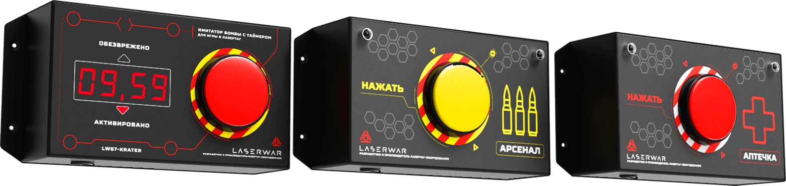 Все герои нашего трио окрашены в контрастные цвета. Чёрный, красный и жёлтый подчеркивают важные элементы на корпусе. Правильная расстановка акцентов не даст игроку отвлечься на второстепенные детали. При этом девайс интересно рассматривать: фирменный шрифт, маркировка изделия и логотип LASERWAR добавляют очков к общему впечатлению. Узнаваемые пиктограммы не позволят перепутать, какой девайс перед вами.