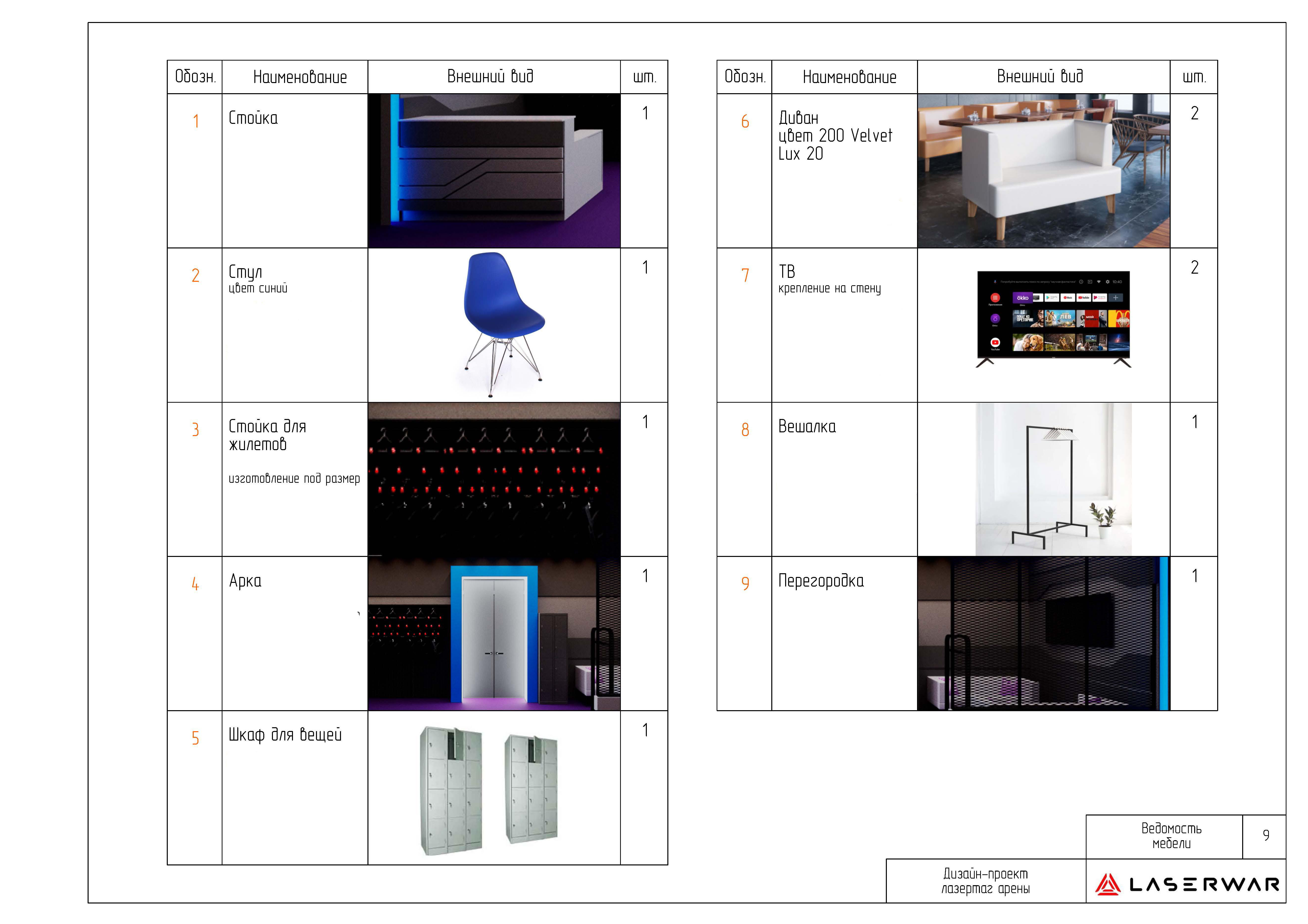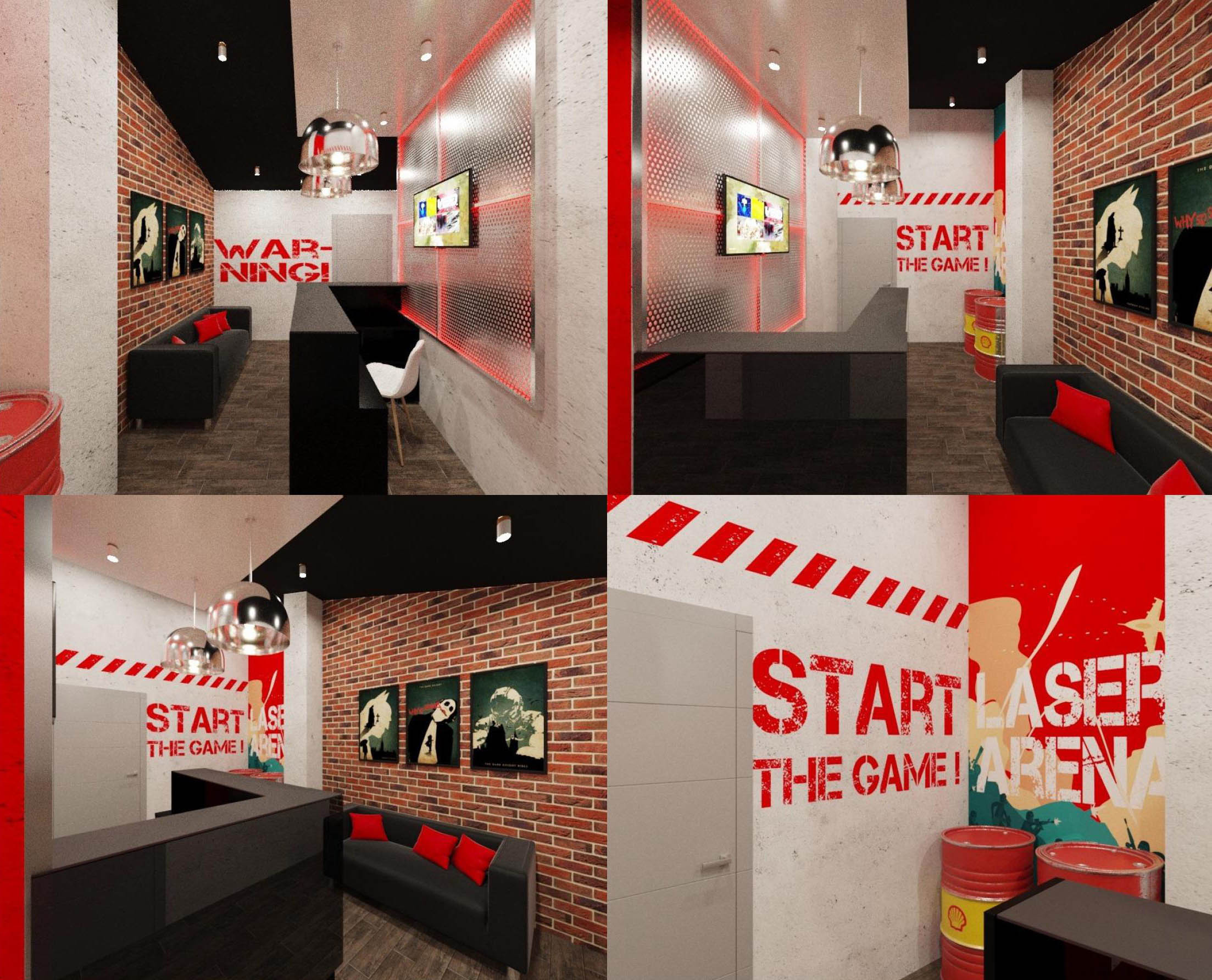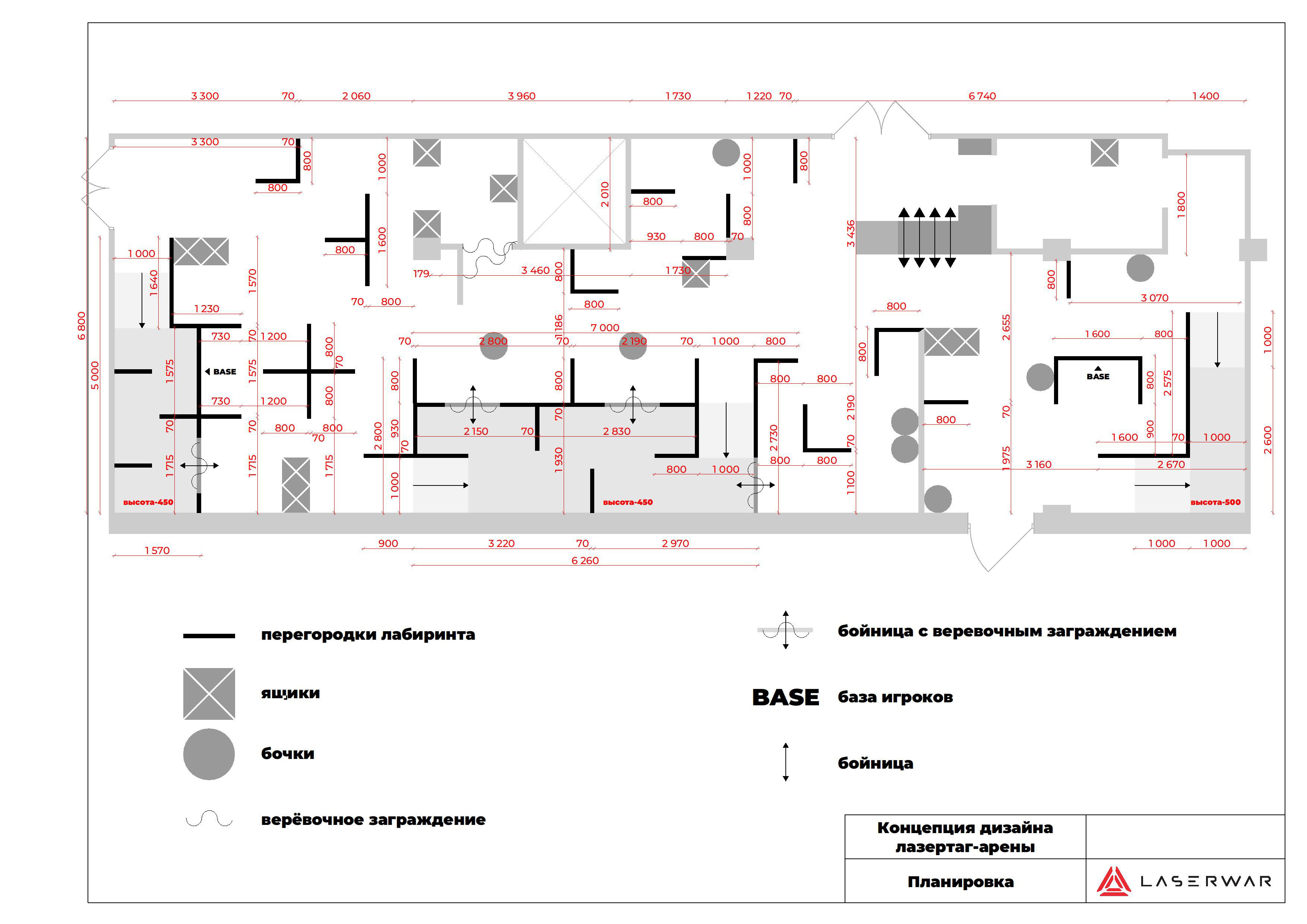 В дизайн-проект арены входят планировка игровой зоны с расстановкой укрытий и интерактивных элементов игры, планировка брифинг-комнаты, планировка вестинг-комнаты (помещения, где располагаются игровые комплекты).