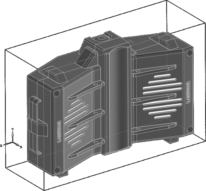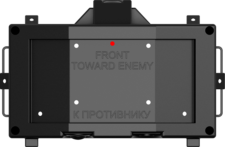 На лицевой стороне 8 ИК-диодов, 2 ИК-сенсора и 1 красный светодиод-индикатор. С обратной стороны в корпусе прорези, за которыми два динамика. В нижней части корпуса гнездо зарядки с резиновой заглушкой на хлястике, кнопка включения. Сверху паз для установки взрывателя, закрытый заглушкой. На задней стороне корпуса выступающие ребра с отверстиями под металлические штыри. По бокам 2 проушины.