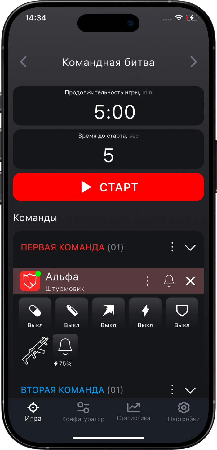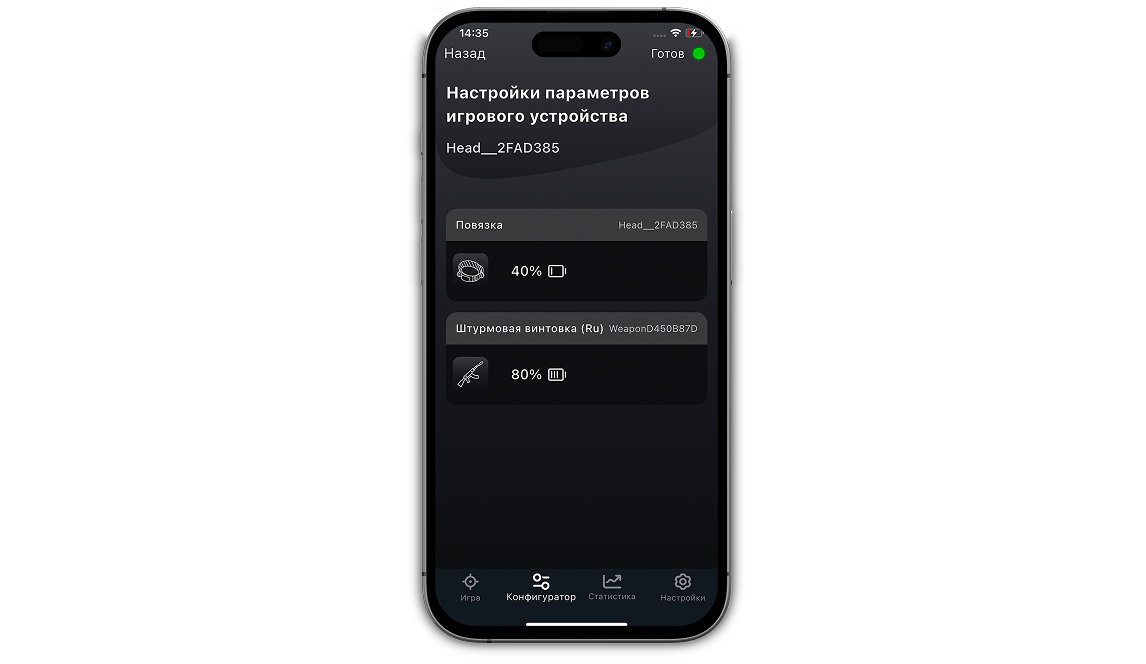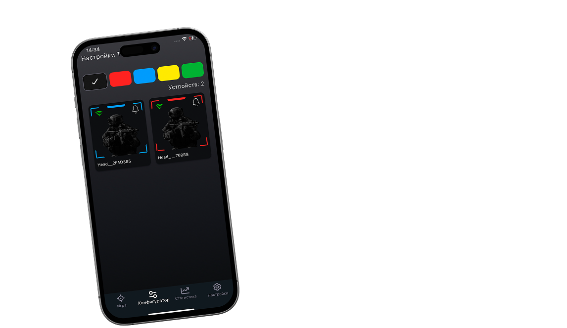 Мобильное приложение задаёт настройки всего подключённого оборудования. На экране показаны комплекты, их имена и статус и цвет команды.