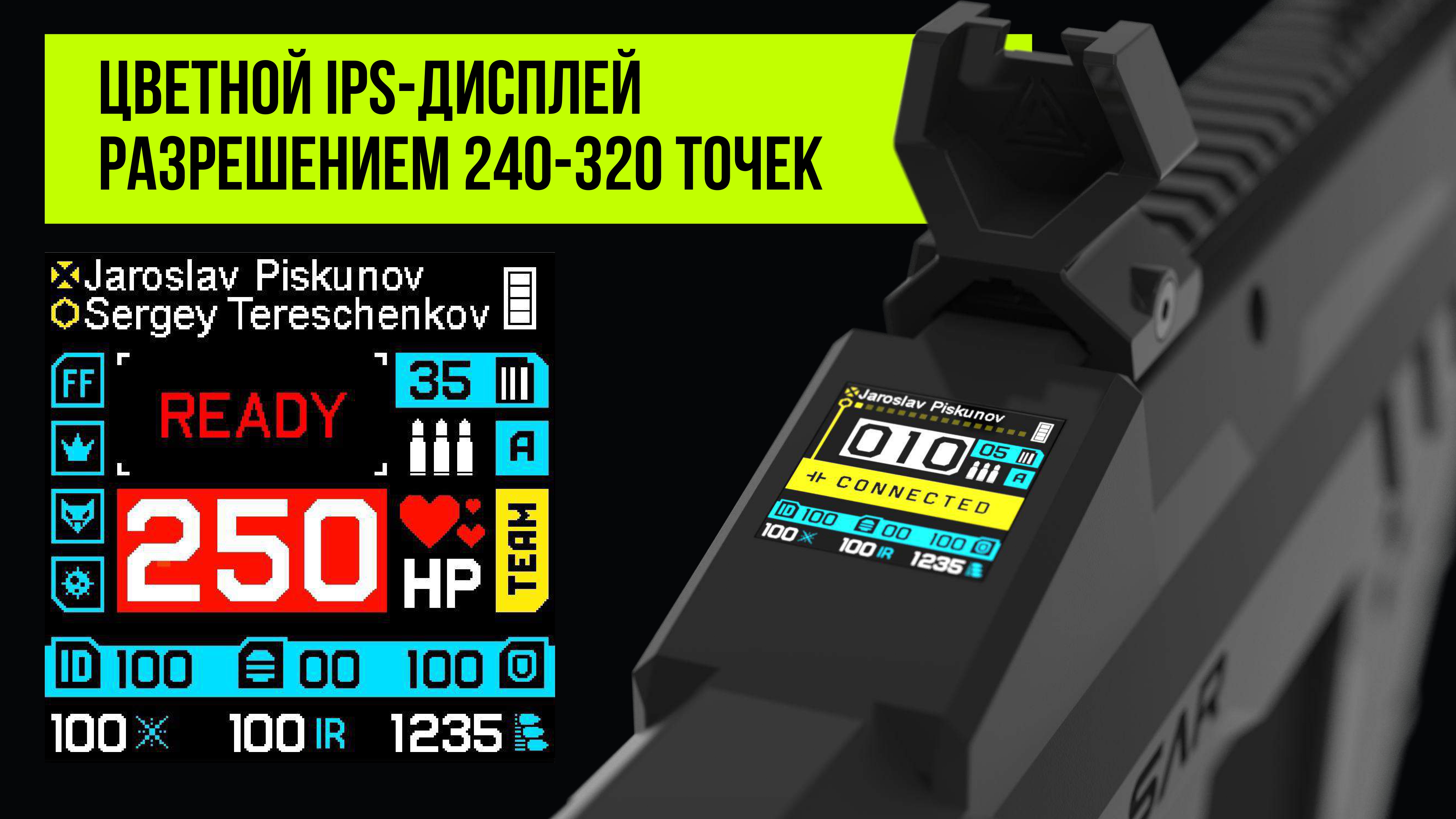 Установили информативный IPS-дисплей размером 320×240. Это классика аренного стиля! Кнопки перезарядки расположены с двух сторон. Корпус ФОТОНА защищён мягким передним бампером и резиновым прикладом. Размеры подобраны под динамичные бои на коротких дистанциях.