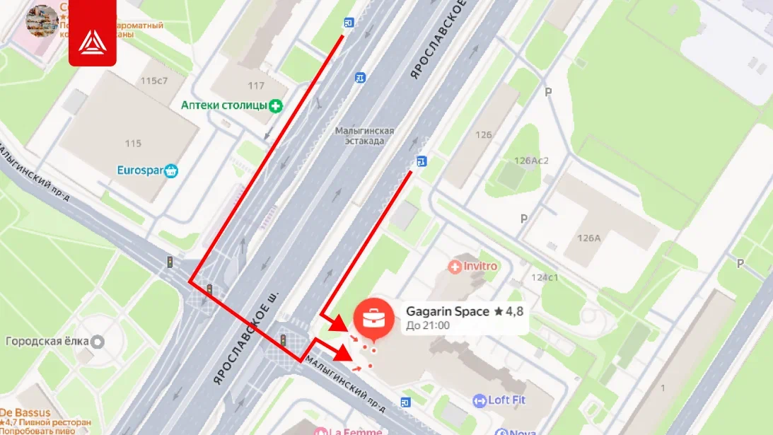 - На такси: закажите поездку до адреса Ярославское шоссе, 124 (GAGARIN SPACE).