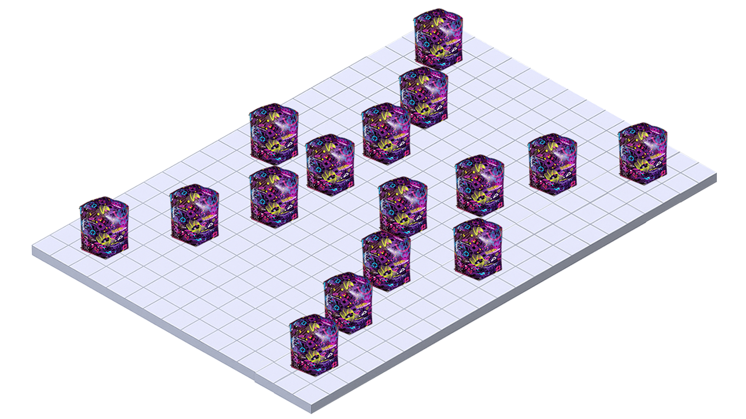 Это универсальное поле из 16 укрытий для активных командных матчей и тренировок. Конфигурация рассчитана на плотное взаимодействие игроков и быстрые игровые эпизоды в формате 3×3.