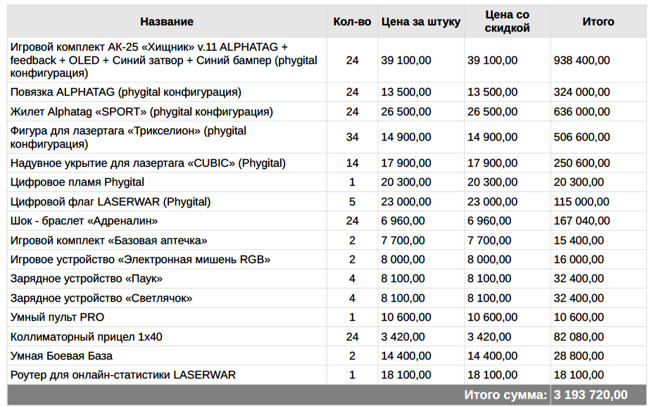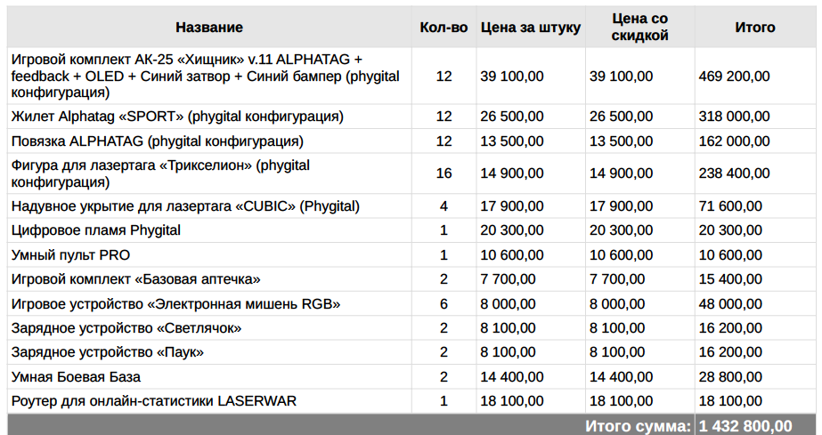 Также в комплекты входят дополнительные устройства, необходимые для проведения занятий по лазертагу и фиджитал-турниров.