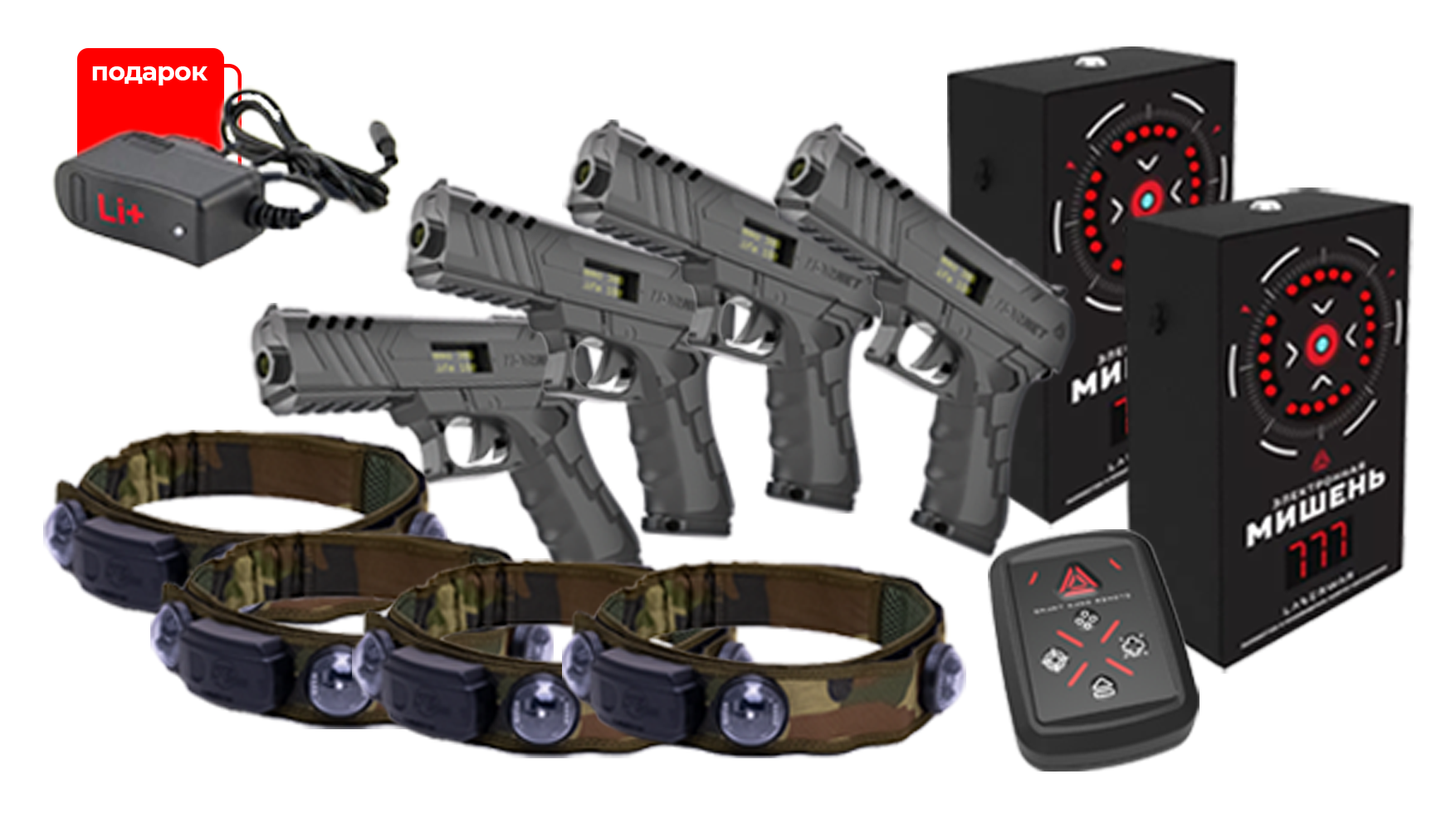 Лазертаг-набор на 4-х «Самый меткий стрелок» состоит из четырёх пистолетов «Шершень» девятого поколения с OLED-дисплеем и Feedback, четырёх датчиков поражения в виде головных повязок, двух электронных мишеней и умного пульта Nano (для дистанционного управления лазертаг-играми).