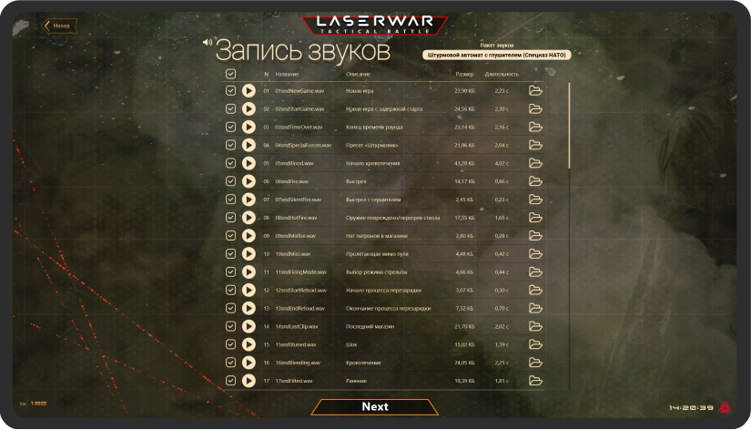 LASERWAR всегда уделяла особе внимание реалистичности своего оборудования. Именно поэтому мы предусмотрели в конфигураторе 10 поколения целый раздел, содержащий 1098 уникальных студийных звуков, объединенных в 18 комбинаций для записи в оборудование. Здесь вы найдёте звуковые эффекты под любую игровую ситуацию – разнообразные русские, английские, а также тематические звуковые пресеты персонажей. Пользователь может выбрать звуки из готовых наборов произвольно или создать свой. При этом скорость записи будет в два раза быстрее, чем в программе 9 поколения.