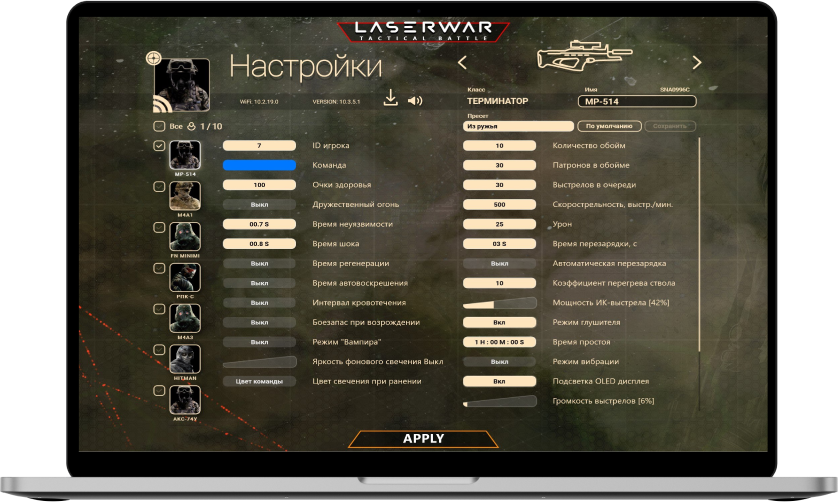 Все характеристики сохраняются как сценарии и меняются одним нажатием кнопки. Дружественный огонь, режим работы датчика поражения оружия, яркость фонового свечения, цвет при ранении, сохранение патронов при перезарядке – всё это доступно для редактирования.